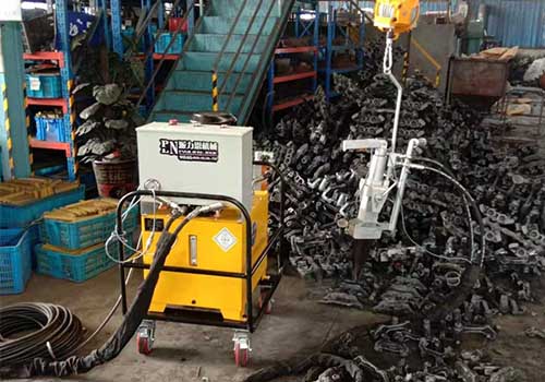 鑄件澆冒口分離器(qi)工作原理:工藝流程是(shi):油泵站(zhan)接380伏電(dian)源,油(you)泵(beng)站和分(fen)離(li)器通過2根高壓油管(一進一出(chu))連接,分(fen)離(li)器(qi)由平衡葫蘆吊懸掛方便操作(zuo)。以下是工作(zuo)原理(li)。鑄件澆冒口(kou)分(fen)離(li)器(qi)通過(guo)液壓泵站(zhan)產生18-70MPa液壓動力(li)。開機時,按下鑄件分(fen)離(li)器手把開關,油泵站由(you)低壓泵送油,當壓力(li)達(da)到(dao)18MPa,高(gao)低(di)壓(ya)切換閥切斷低(di)壓(ya)泵,這(zhe)時,由高(gao)壓(ya)柱塞(sai)泵工(gong)作送油,高(gao)壓(ya)柱塞(sai)泵產生大70Mpa工作壓(ya)力(li)(高(gao)(gao)低(di)壓(ya)切換原理就是(shi)低(di)壓(ya)泵(beng)快速送大(da)量(liang)的油,而高(gao)(gao)壓(ya)柱(zhu)塞(sai)泵(beng)是(shi)少量(liang)油產(chan)生(sheng)高(gao)(gao)壓(ya),大(da)程(cheng)度防止(zhi)大(da)量(liang)油進出,防止(zhi)油泵(beng)站升溫),油管內高(gao)(gao)壓(ya)油推動(dong)(dong)分(fen)(fen)離(li)器(qi)油缸內活塞(sai),活塞(sai)推動(dong)(dong)前端尖(jian)鐵(tie),尖(jian)鐵(tie)向(xiang)兩邊推動(dong)(dong)楔鐵(tie),以上(shang)油壓(ya)一系列(lie)動(dong)(dong)作產(chan)生(sheng)大(da)噸分(fen)(fen)離(li)張力(li),將鑄件澆冒口(kou)分(fen)(fen)離(li)器(qi)從母體(ti)(ti)分(fen)(fen)離(li)下來。